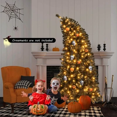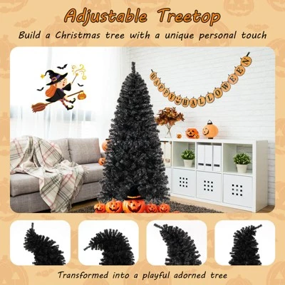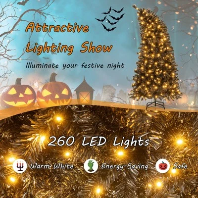 Create a spooky ambiance with the 6 ft Halloween tree, featuring 726 branch tips that are made of premium PVC material for a full-bodied look, while being smell-free, fireproof, and anti-fading. Adorned with 260 warm white LED lights, it displays an attractive lighting show and can illuminate your festive night. The artificial decoration tree also has an adjustable treetop, enabling you to build a Christmas tree with a unique personal touch. The hinged structure allows branches to shape easily and ensures a stress-free installation. In addition, the tree boasts a folding metal stand that provides a sturdy base. This versatile black Halloween tree is ideal for Halloween and Christmas, adding timeless elegance to any setting. Happy Halloween!