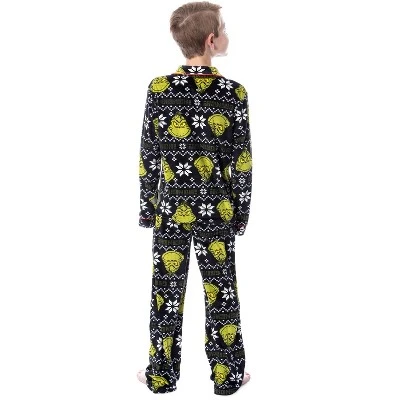 - QUALITY PRINTED DESIGN – The long sleeve soft polyester top on the women, men, and kids’ pajama sets has a Fair Isle design that features a notch collar, front left pocket, and button-down closure. GRINCH pajama pants have a wonderful in-fabric allover pattern of GRINCH face with snowflakes that match the top. The fabric is super soft, and the bottoms have a wide lace tie closure and a fly for men’s sizes. You will want to wear these pajamas every night!